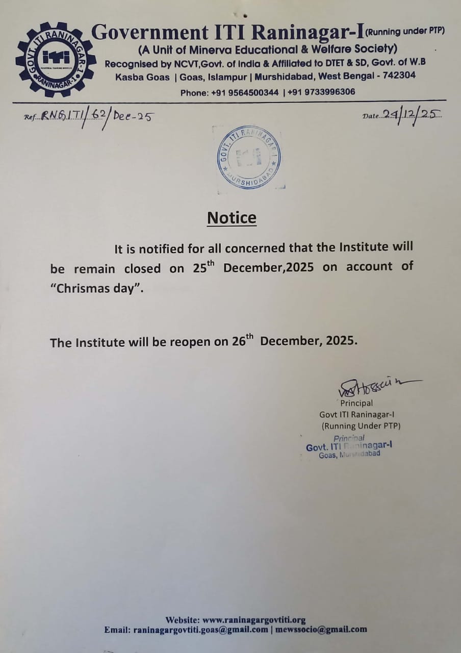 Government ITI Raninagar-I running under PTP is NCVT affiliated ITI conducting Industrial Training in the areas of Electrician, Surveyor, Fitter, Draughtsman (Mechanical), Plumber, and Computer Hardware and Network Maintenance .It was established in the year 2016 with a mission to provide technical education mainly to the unemployed youth. Govt. ITI Raninagar-I is situated at Kasba Goas (Near Raninagar-1, Kishak Bazar), Islampur, Murshidabad,WestBengal-742304